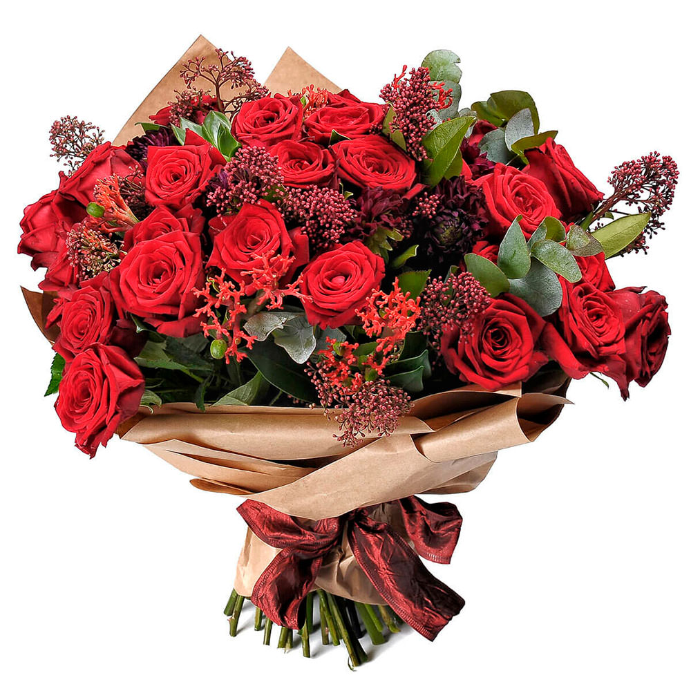 Роза одноголовая красная, зелень декоративная, озотамнус. Упаковка (лента, пленка, крафт, сетка, пленка матовая)