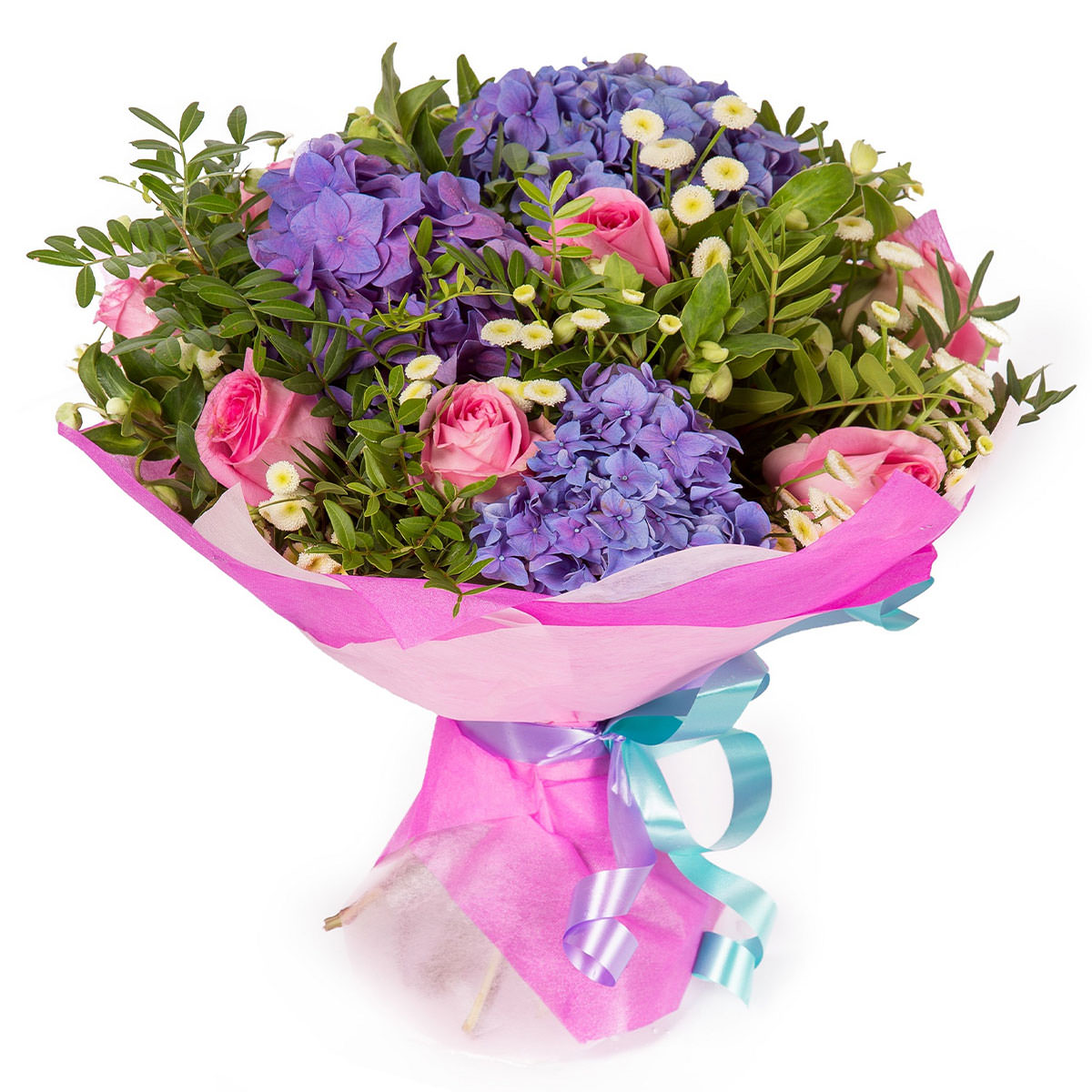 Гортензия фиолетовая, роза одноголовая розовая, маргаритка белая, фисташка. Упаковка (лента, пленка, крафт, сетка, пленка матовая)