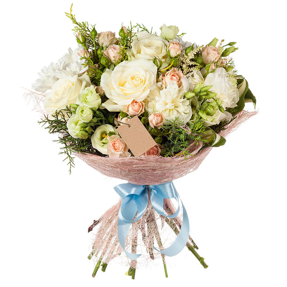Роза одноголовая белая, роза кустовая нежно-розовая, эустома белая, хризантема кустовая белая, эвкалипт. Упаковка (лента, пленка, крафт, сетка, пленка матовая)