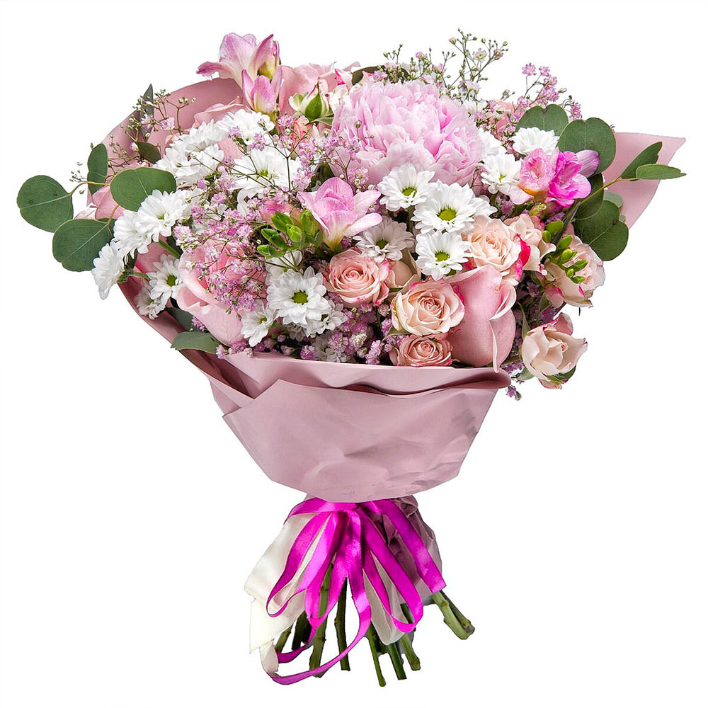 Хризантема кустовая белая, пион розовый, роза кустовая кремово-розовая, роза одноголовая розовая, фрезия розовая, эвкалипт, гипсофила. Упаковка (лента, пленка, крафт, сетка, пленка матовая)