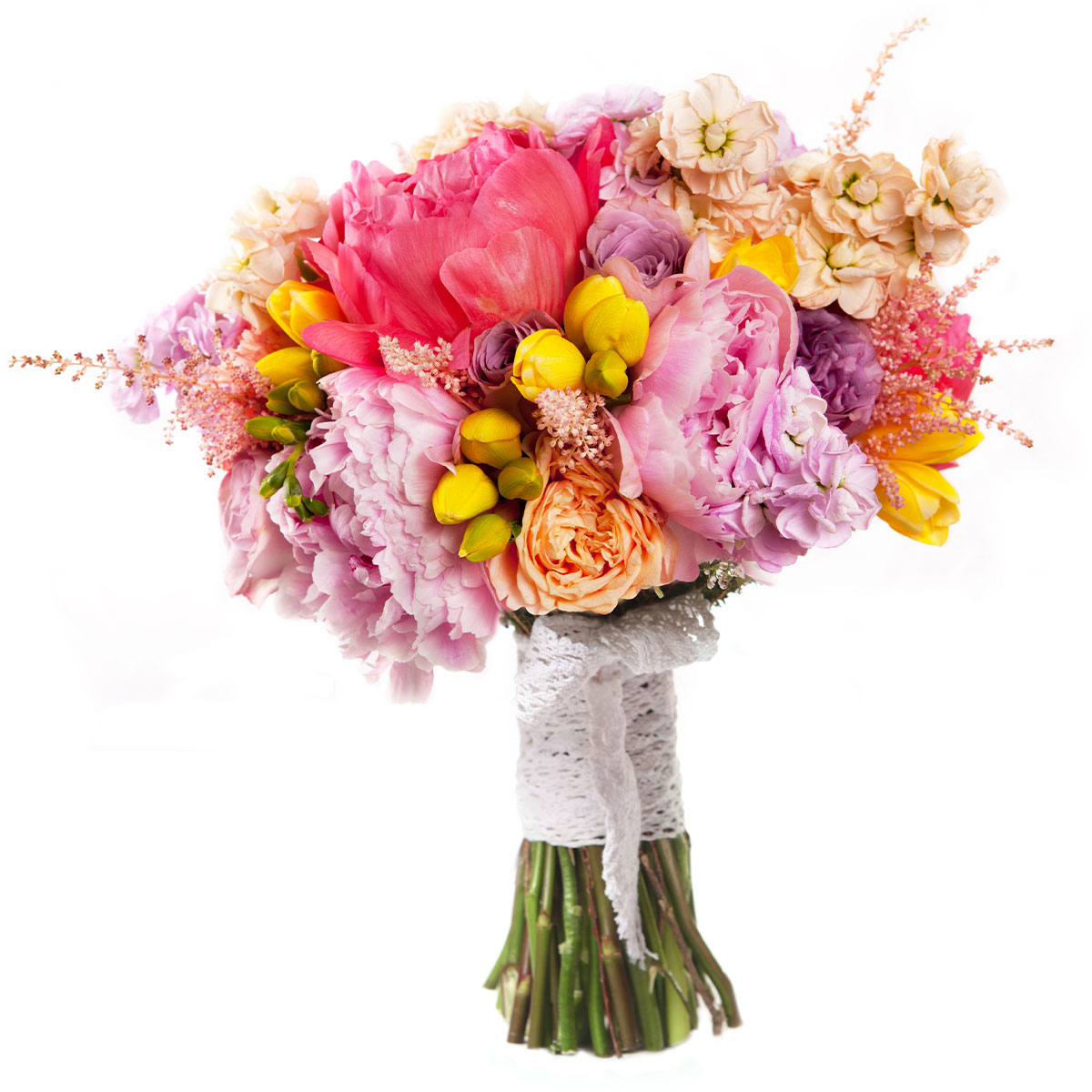 Пион коралловый и розовый, фрезия желтая, маттиола кремовая и розовая, роза одноголовая сиреневая, роза пионовидная персиковая. Упаковка (лента, пленка, крафт, сетка, пленка матовая)