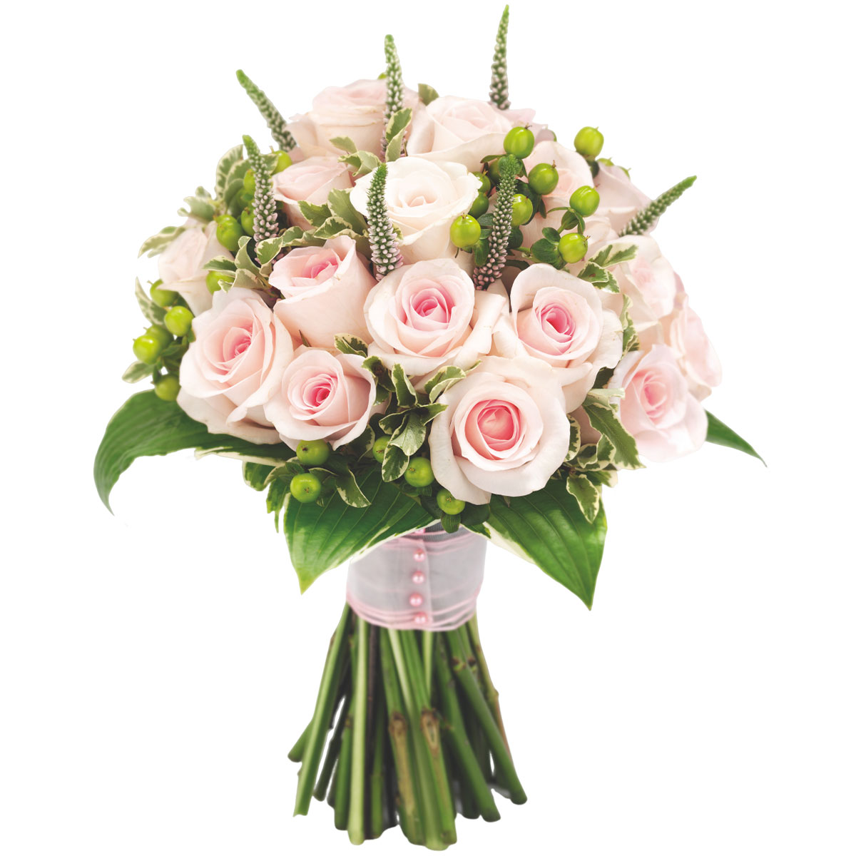 Роза одноголовая розовая, вероника, гиперикум, зелень. Упаковка (лента, пленка, крафт, сетка, пленка матовая)
