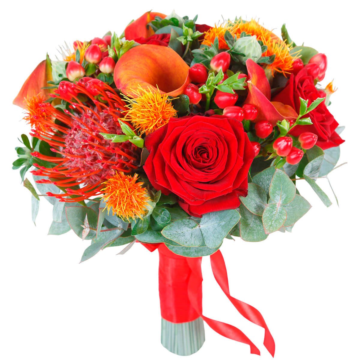 Роза одноголовая красная, калла оранжевая, леукосперум, гиперикум, сафлор красильный, эвкалипт. Упаковка (лента, пленка, крафт, сетка, пленка матовая)