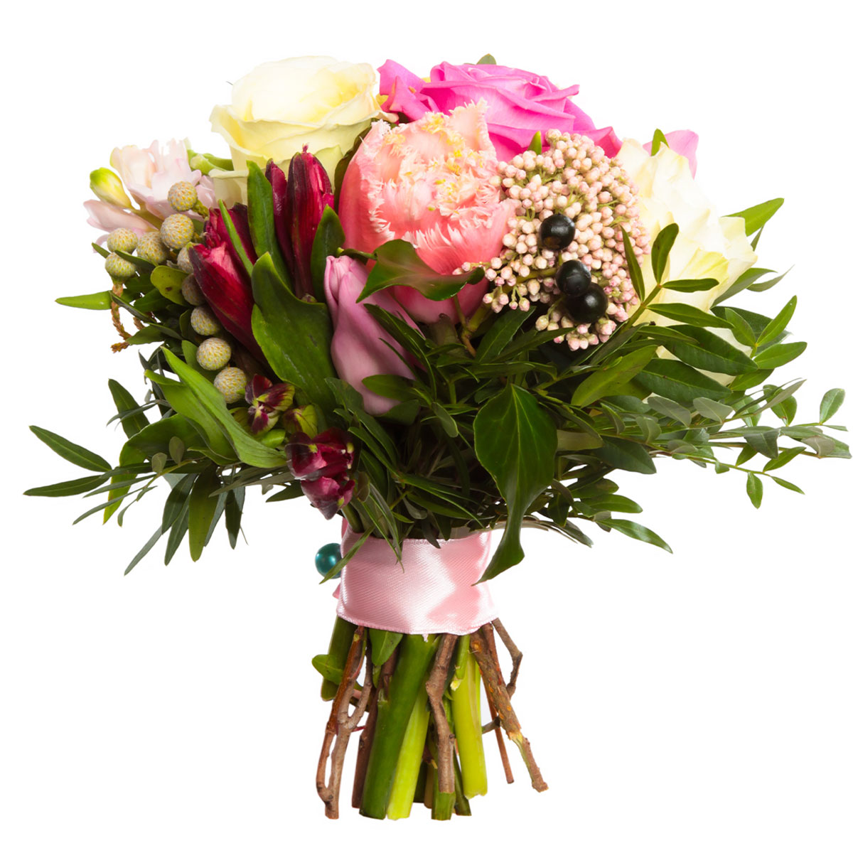 Роза одноголовая белая и розовая, тюльпан розовый, озотамнус, бруния, фисташка. Упаковка (лента, пленка, крафт, сетка, пленка матовая)