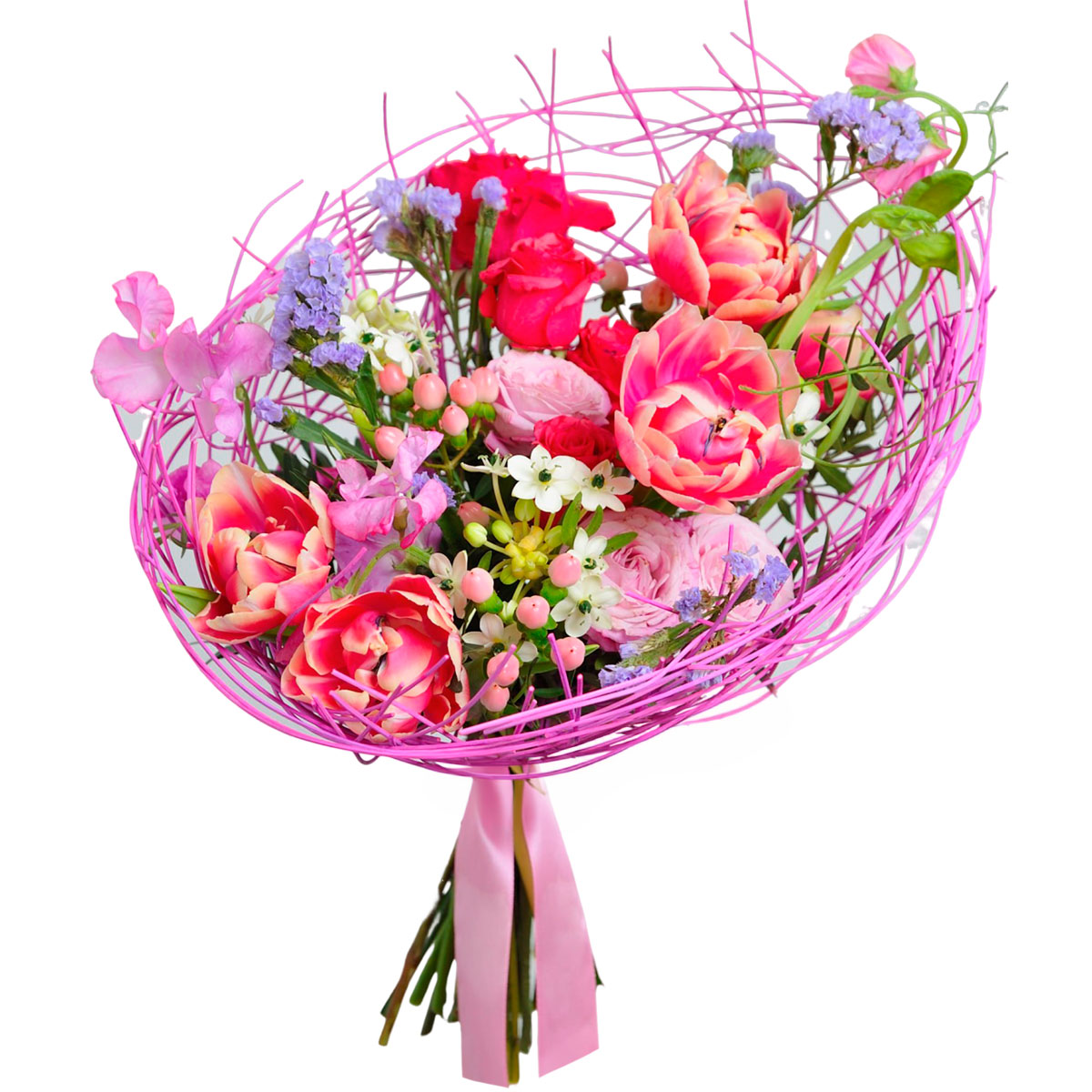 Тюльпан розовый, роза кустовая розовая, олеандр, орнитогалум сандерс, гиперикум, статица. В каркасе