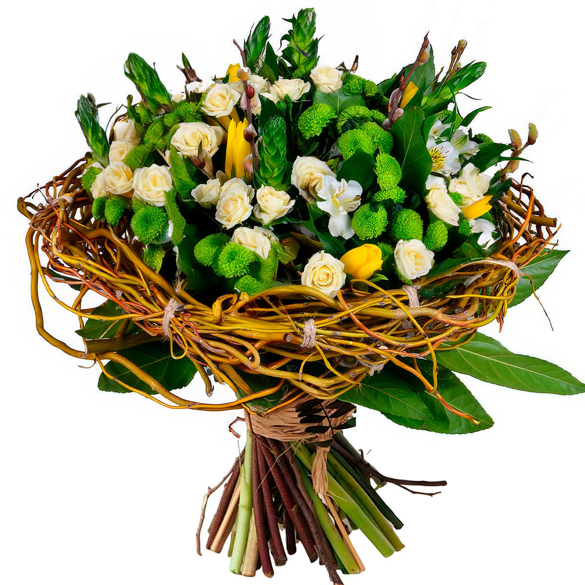 Роза кустовая желтая, хризантема кустовая зеленая, альстромерия белая, тюльпан желтый, зелень. В каркасе