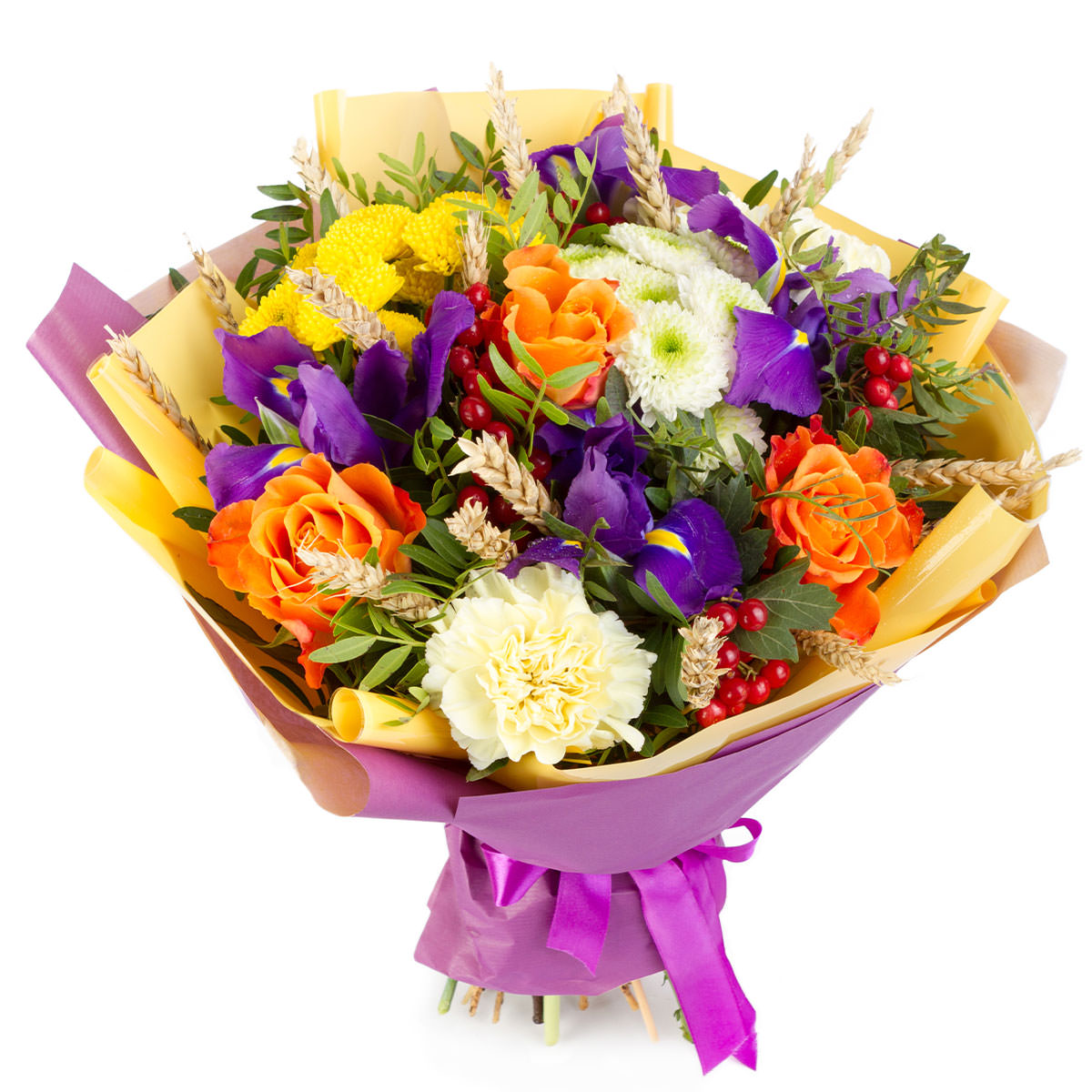 | Состав | Гвоздики, Ирисы, Колос, Розы, Хризантемы |