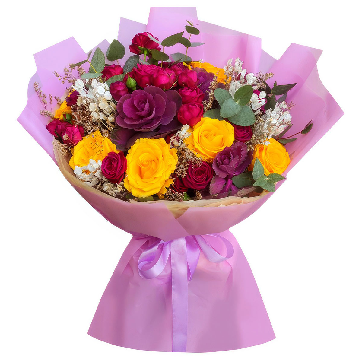 Брассика, роза кустовая розовая, роза одноголовая желтая, эвкалипт, лунария. Упаковка (лента, пленка, крафт, сетка, пленка матовая)