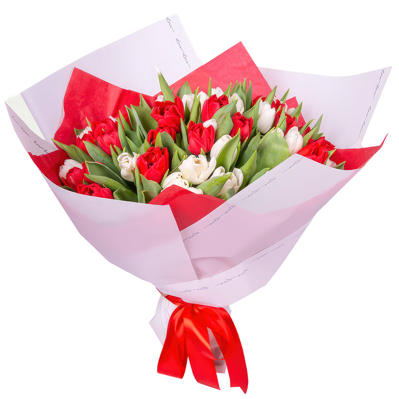 Тюльпан белый и красный. Упаковка (лента, пленка, крафт, сетка, пленка матовая)