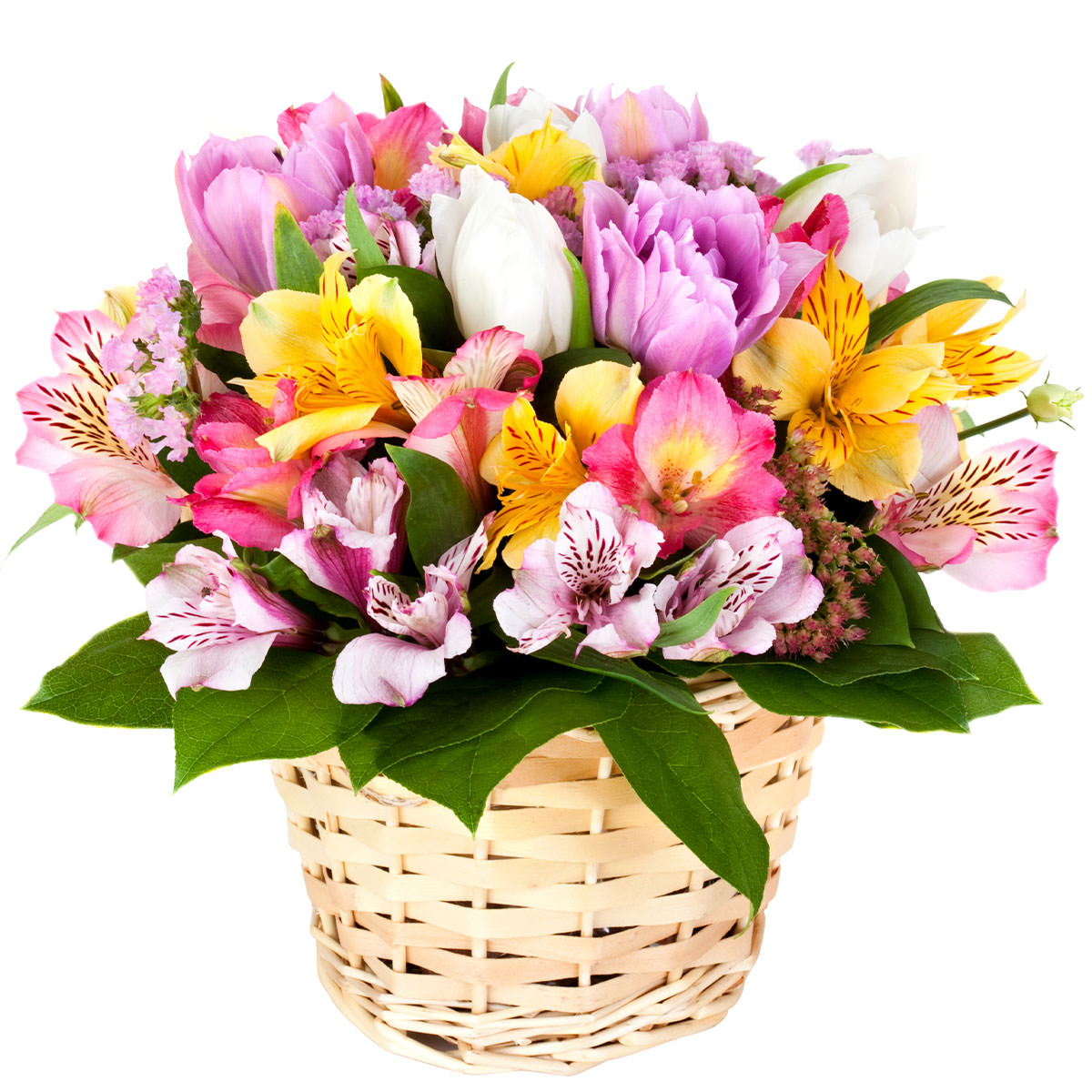 Альстромерия разных цветов, тюльпан сиреневый и белый, статица. Упаковка (Корзина, оазис, ящик).