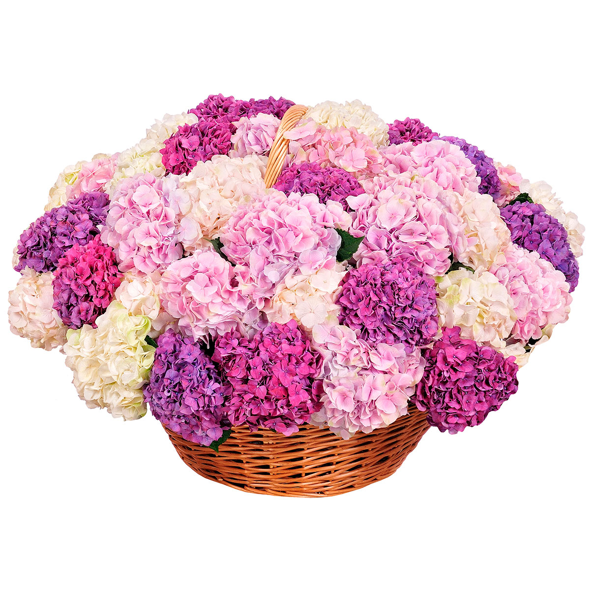 Гортензия розовая, сиреневая и белая. Упаковка (Корзина, оазис, ящик).