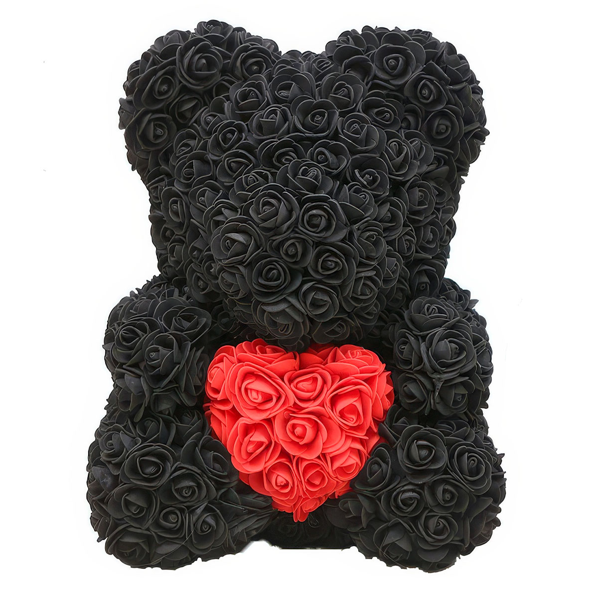 Мишка из роз черный с красным сердцем — созданный из более чем 600 великолепных 3D розочек.