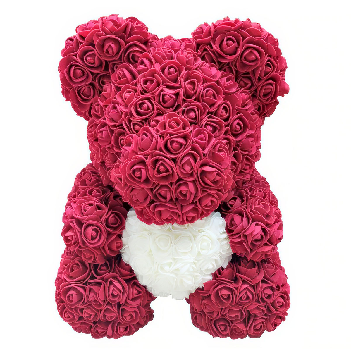 Мишка из роз фуксия с белым сердцем — созданный из более чем 600 великолепных 3D розочек.