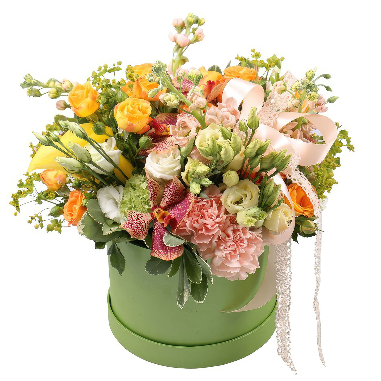 Орхидея ванда, роза кустовая желтая, маттиола розовая, эустома кремовая, диантус розовая, калла желтая, зелень. Упаковка (шляпная коробка, квадратный бокс, коробка сердце, оазис)