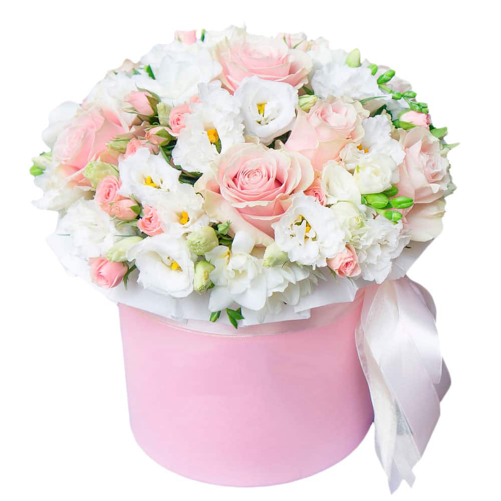 Роза одноголовая нежно-розовая, эустома белая. Упаковка (шляпная коробка, квадратный бокс, коробка сердце, оазис)