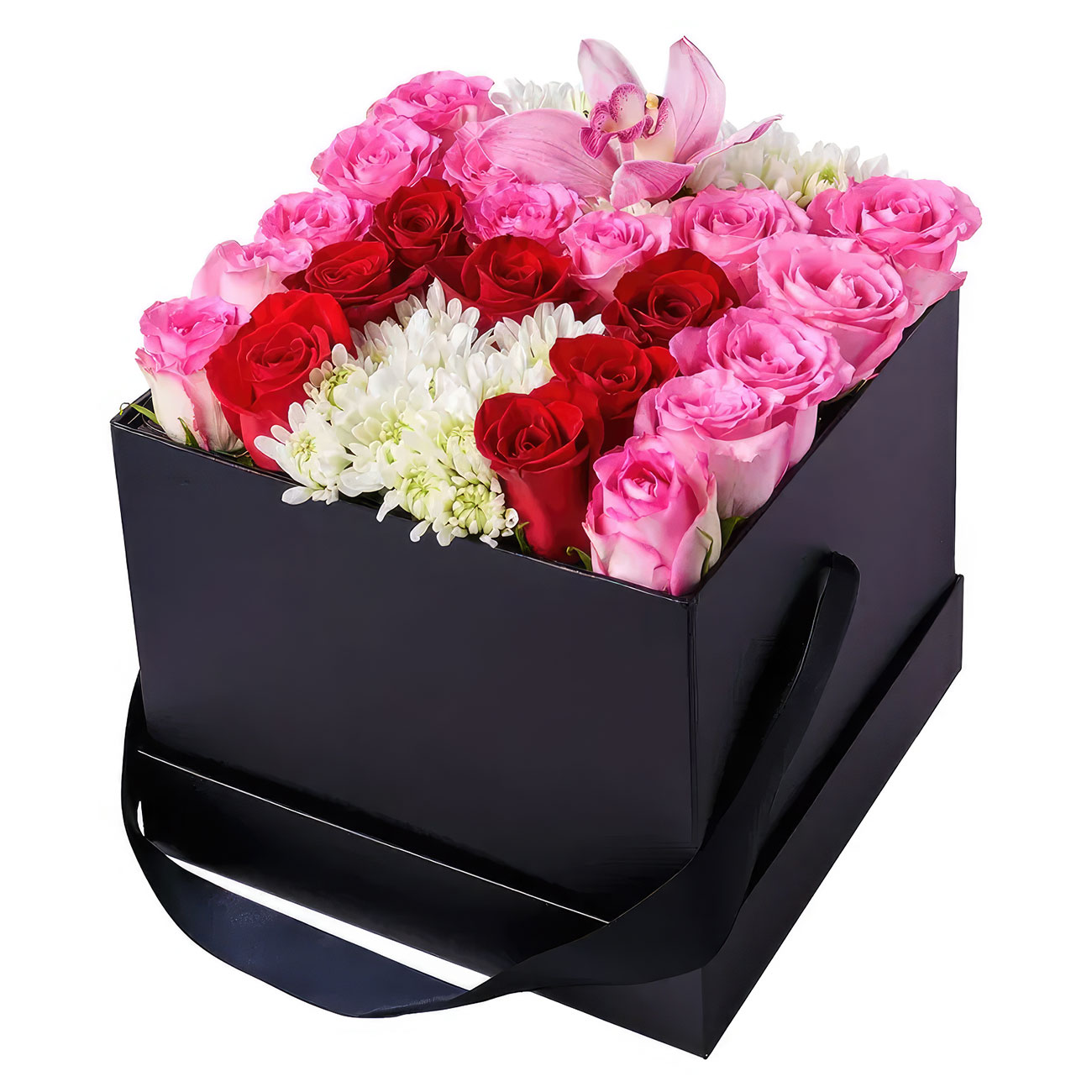Хризантема белая кустовая, роза одноголовая розовая, красная, орхидея. Упаковка (шляпная коробка, квадратный бокс, коробка сердце, оазис)